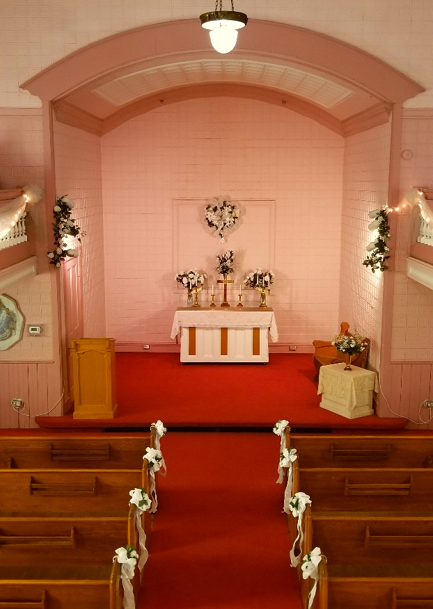 As you enter the chapel today, you will see its beautiful stained glass windows, pressed tin ceiling, and wraparound balcony. The first floor can seat 120 people comfortably, and the balcony an additional 50-60 people. An organ and piano are available for use, and the 136 year old chapel bell stands ready to announce the newly married couple.
